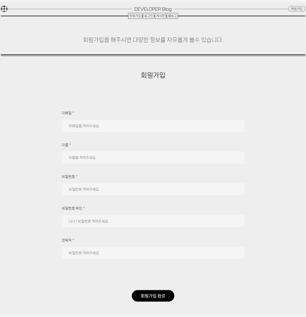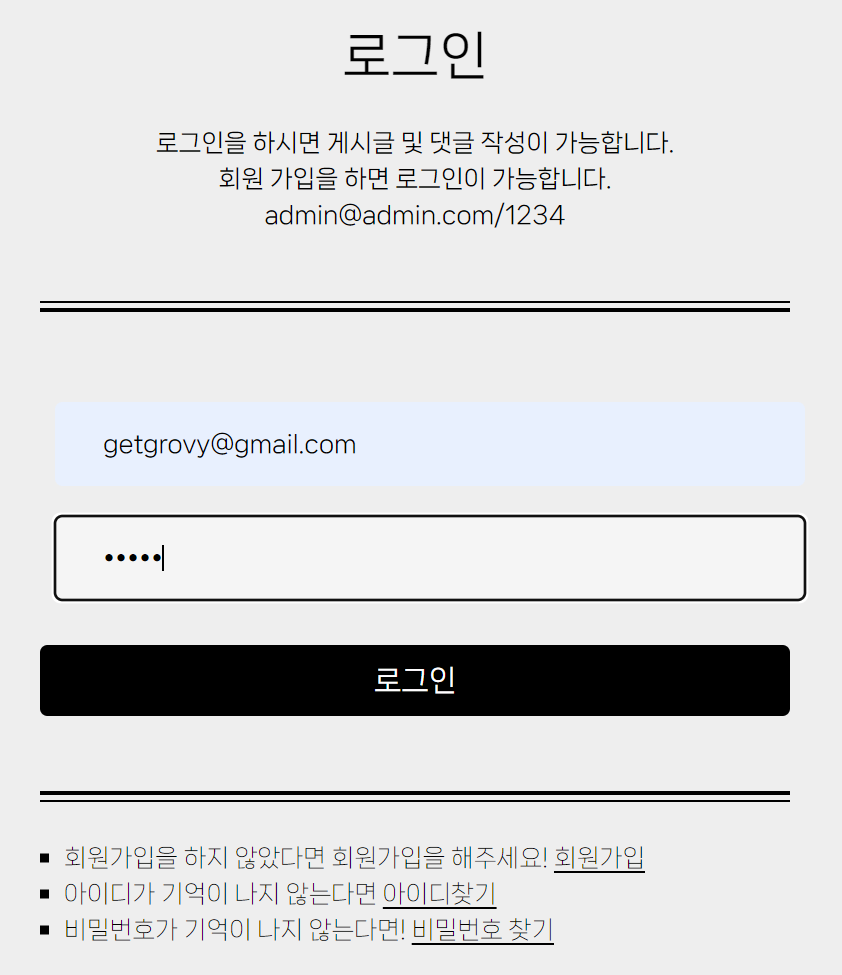 <p>로그인을 하시면 게시글 및 댓글 작성이 가능합니다.<br>회원 가입을 하면 로그인이 가능합니다.<br>admin@admin.com/1234 </p>